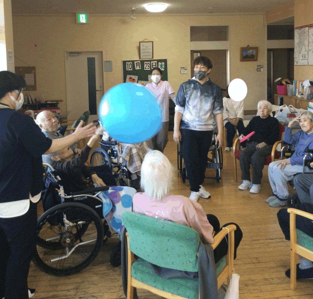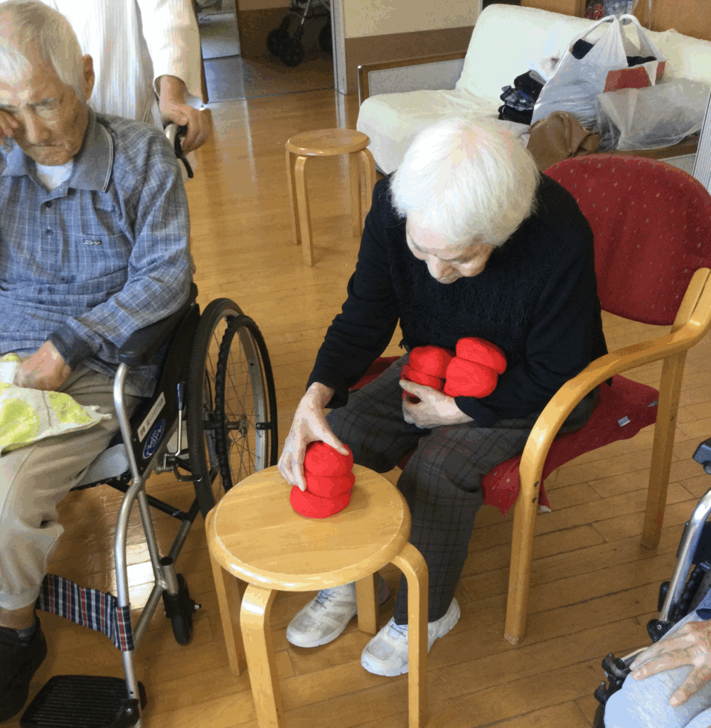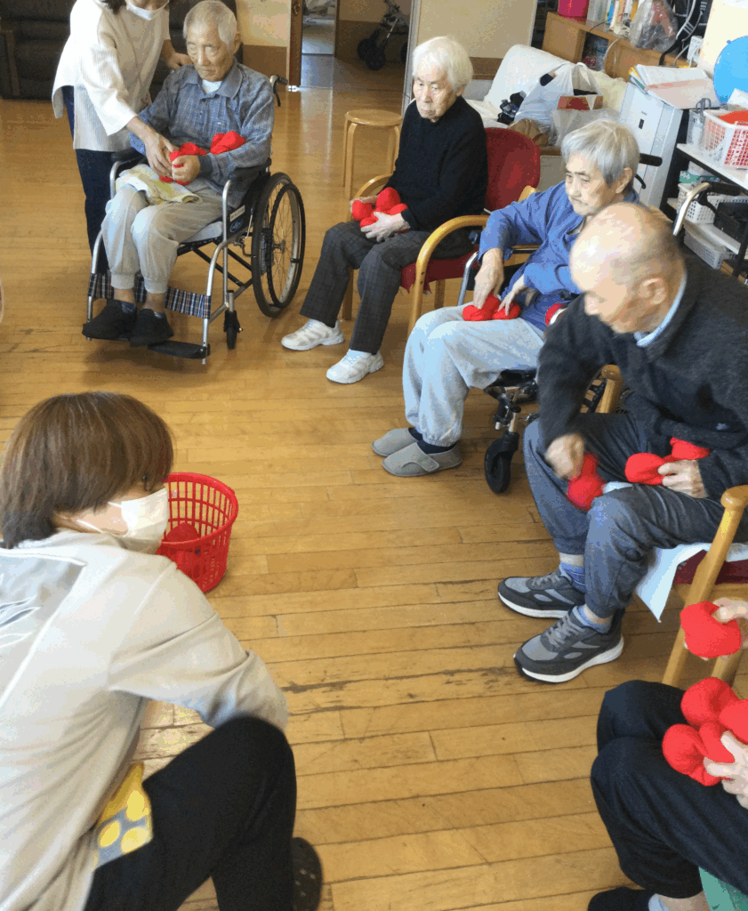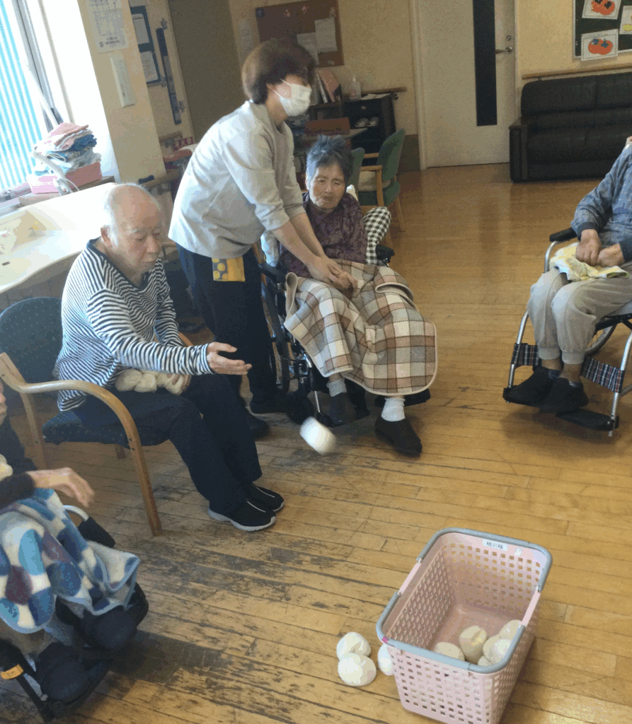 さて、グループホームはるかでは、運動会を行いました。玉入れ・玉つみ・パン食いとり・風船バレー・スリッパ飛ばしを行いました。赤・白での対抗とあって一生懸命頑張っていました。