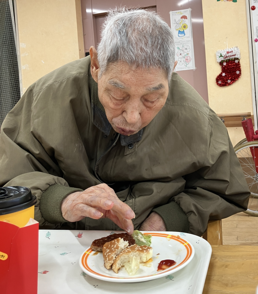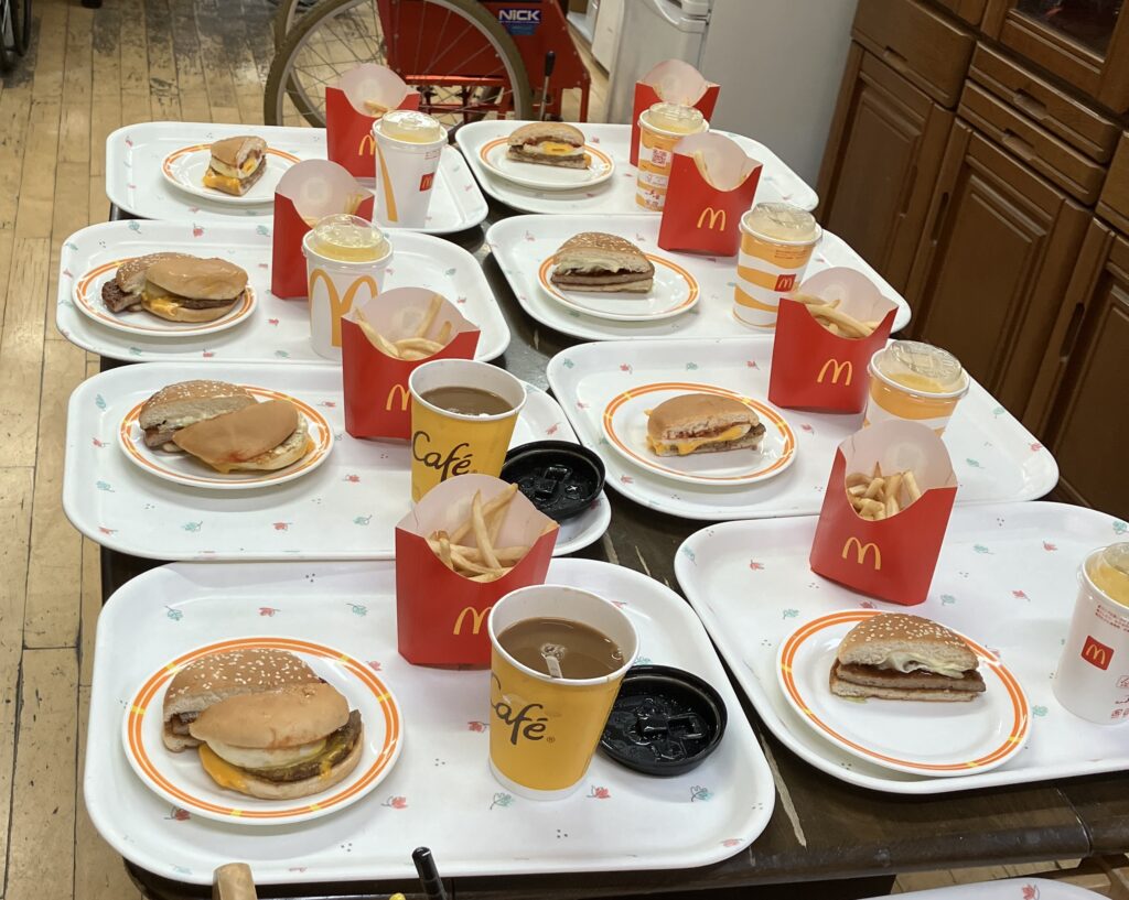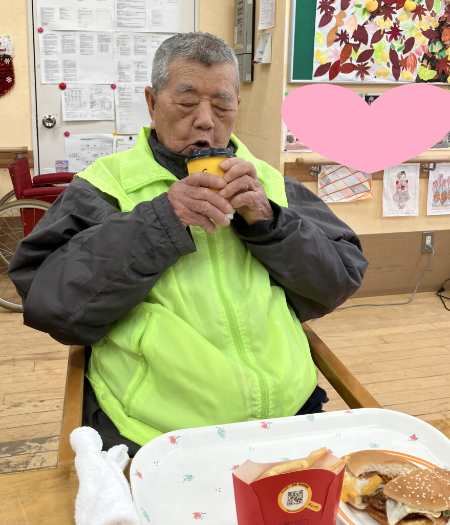 男性利用者様にはハンバーガー🍔一つにポテト🍟ドリンクはコーヒー☕を提供させていただきました。