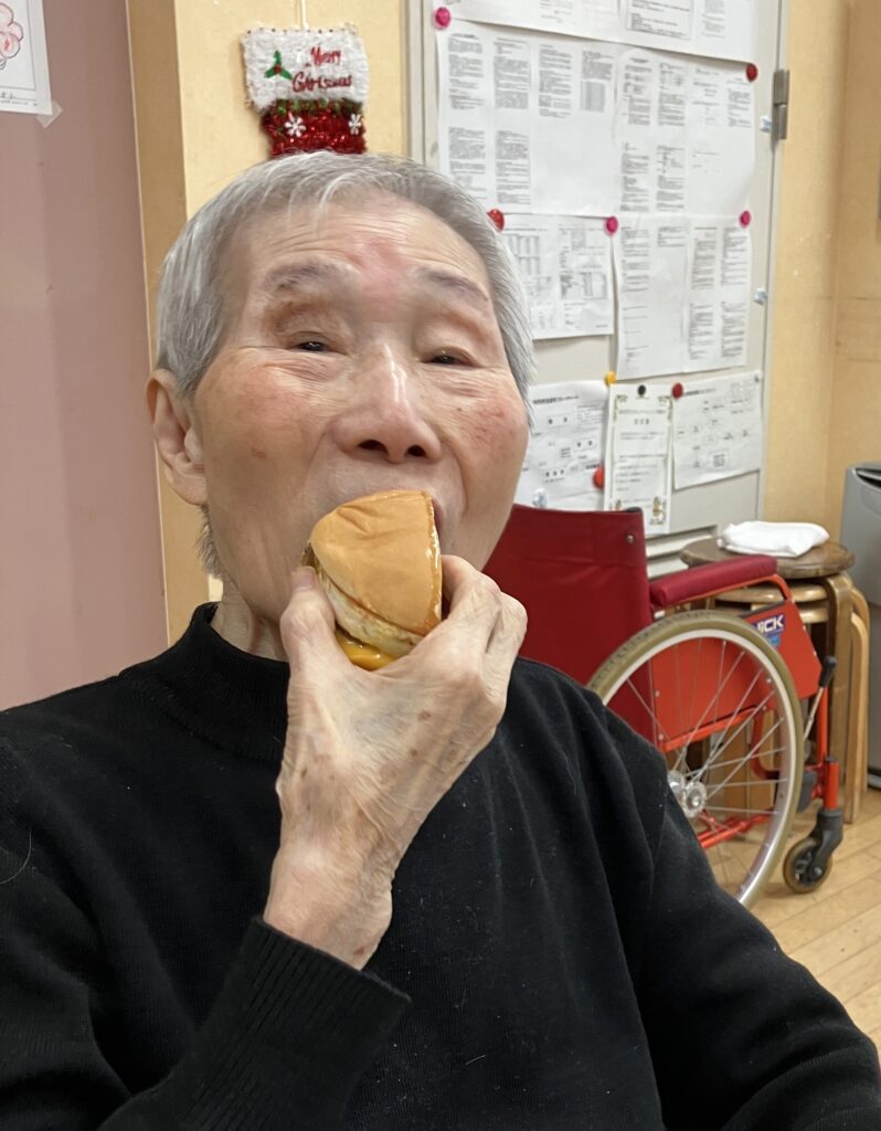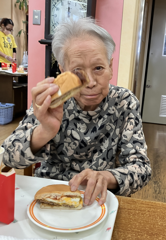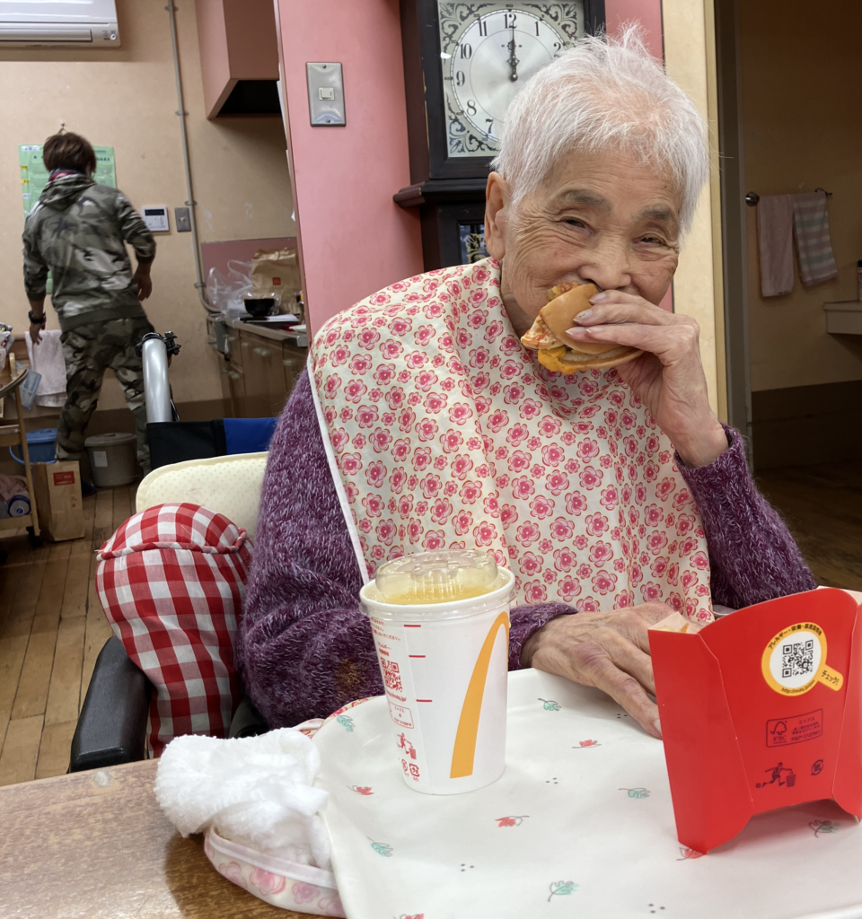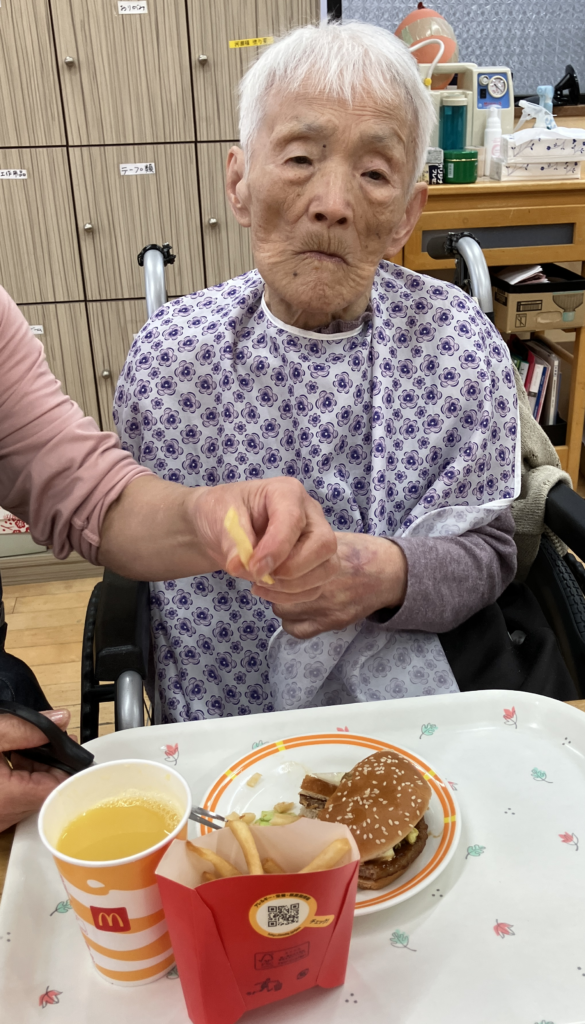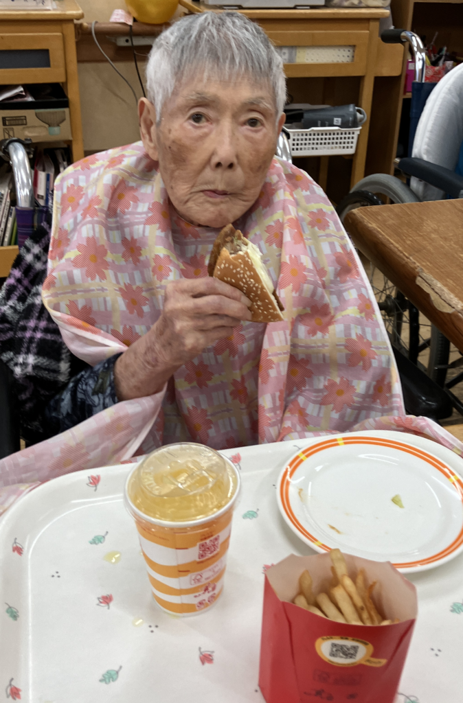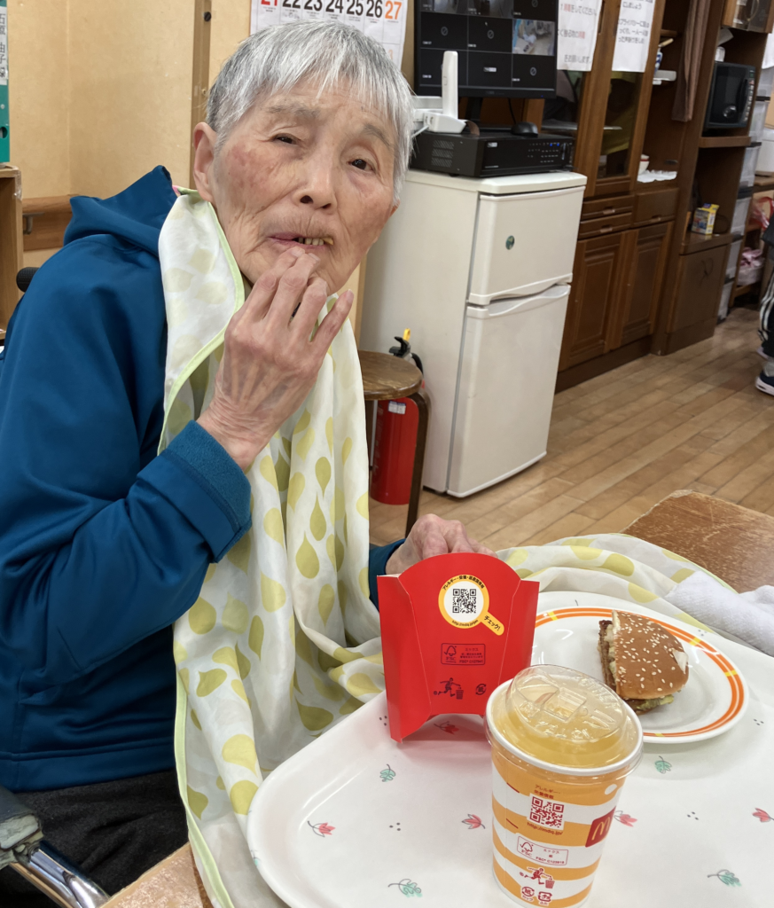 女性利用者様にはハンバーガー🍔半分とポテト🍟ドリンクはオレンジジュース🍊を提供。