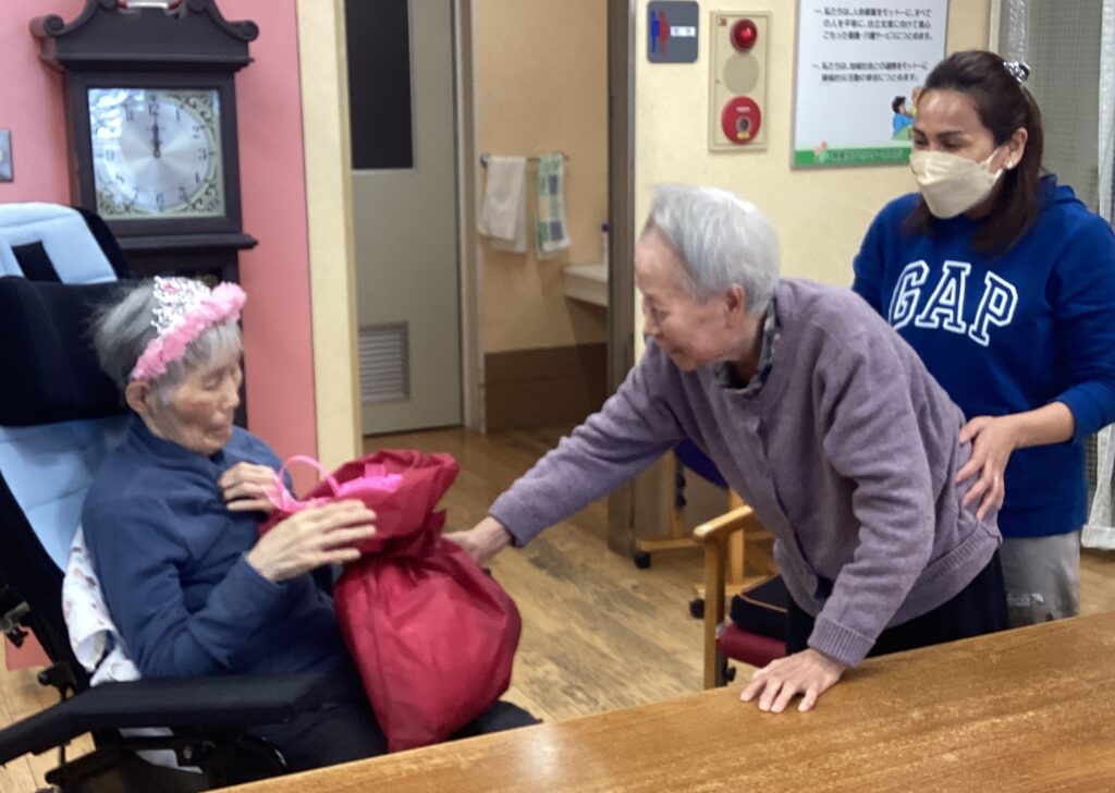 利用者K様からプレゼント贈呈(フットウォーマー)しました。